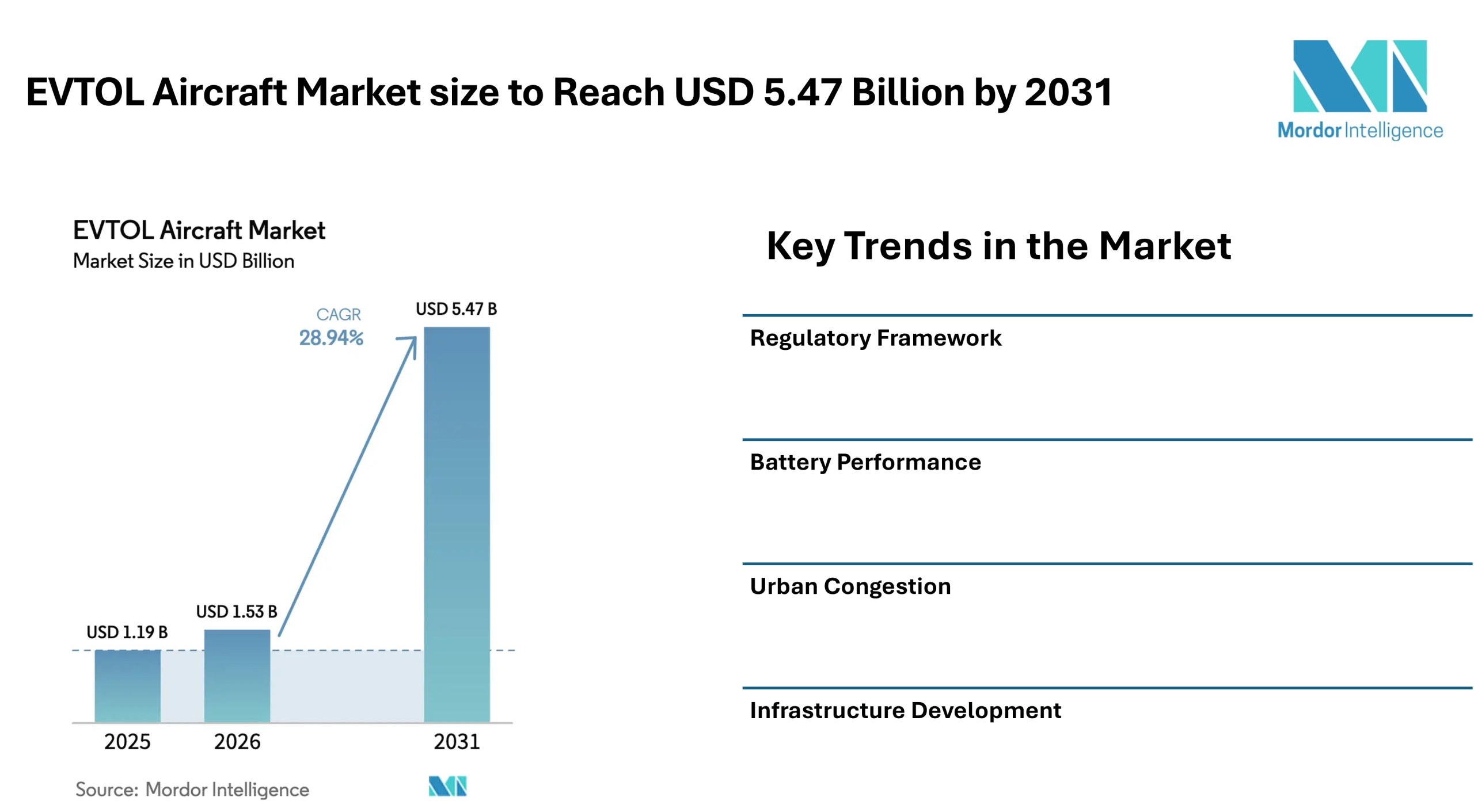 According to Mordor Intelligence, the eVTOL aircraft market size is expected to grow from USD 1.19 billion in 2025 to USD 1.53 billion in 2026 and is projected to reach USD 5.47 billion by 2031, registering a CAGR of 28.94% during the forecast period.