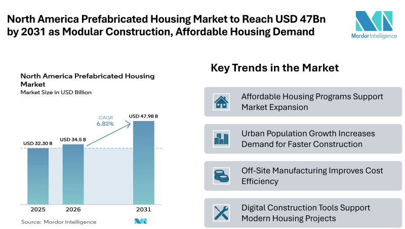 According to Mordor Intelligence, the North America Prefabricated Housing Market Size was valued at USD 32.3 billion in 2025 and is estimated to increase from USD 34.5 billion in 2026 to reach USD 47.98 billion by 2031, registering a CAGR of 6.82% during the forecast period (2026-2031). The market is witnessing steady development as construction companies, housing agencies, and developers look for faster building solutions to address the region’s housing shortage.